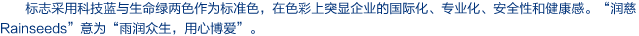 标志以“润”和“心”字的基本形态进行演变,三个“三点水”的偏旁部首衍生出九个圆润饱满、发展变化、充满生命力的水态图形,诠释“润”字给人带来的“图形”心理感受——雨润万物、温润而泽、积水成渊,进而令人想到“海纳百川、有容乃大”的博大至远;图形变化为九个点,为中国传统数理中最大的数字,代表着圆满、丰富、极大,象征着企业发展的无限空间;右下方的四个点两两相溶,互动相依,分别与上面的两点组成两个人形,体现了企业真诚服务、互惠合作、造福众生、以人为本的经营原则。